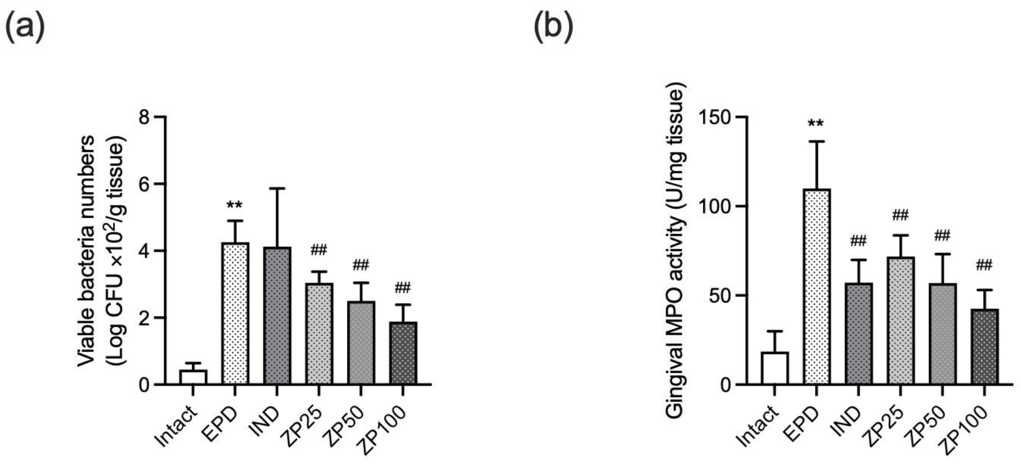 Figure 5. Effect of ZP on total anaerobic bacterial counts and myeloperoxidase (MPO) activity in buccal gingival tissues. (a) Anaerobic bacterial count. Gingival tissues were homogenized, and cultured under anaerobic conditions, and colonies counted as ×102 colony-forming units (CFU)/g of tissue. (b) MPO activity. One unit is defined as the amount of enzyme degrading 1 μM H2O2 per min at 25 °C. Data are presented as mean ± SD from ten animals per group. Significance versus intact vehicle control group, ** p < 0.01; versus EPD control group, ## p < 0.01.