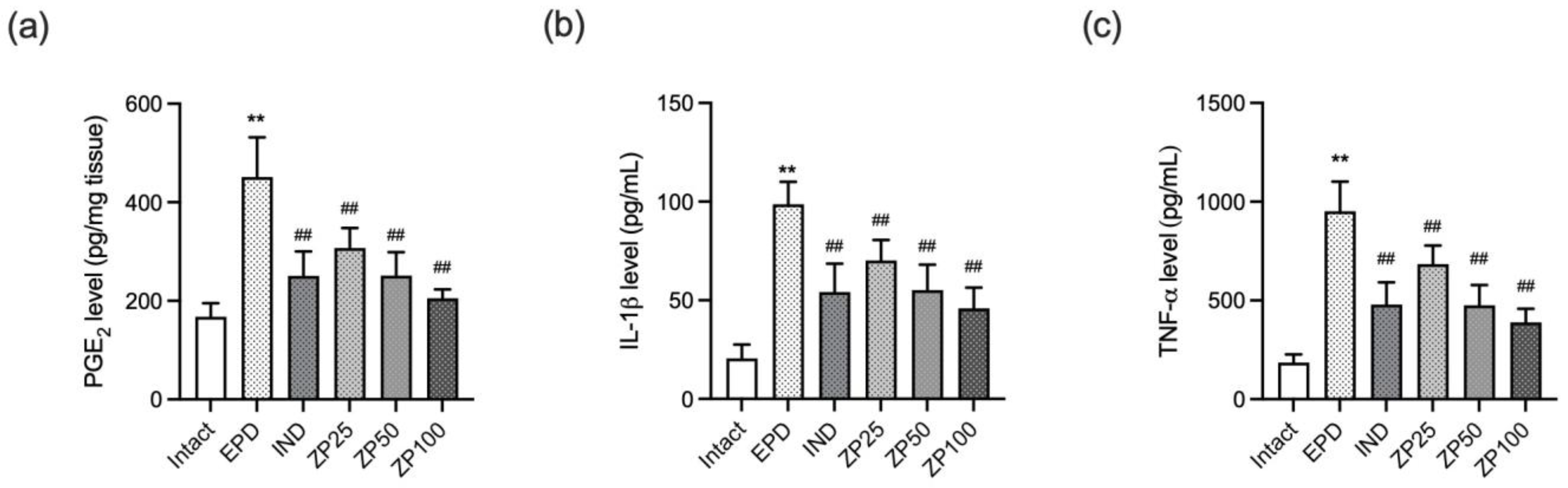 Figure 6. ZP lowered the gingival levels of pro-inflammatory mediators including (a) PGE2, (b) IL-1β, and (c) TNF-α in EPD rats. Data are presented as mean ± SD from ten animals per group. Significance versus intact vehicle control group, ** p < 0.01; versus EPD control group, ## p < 0.01.