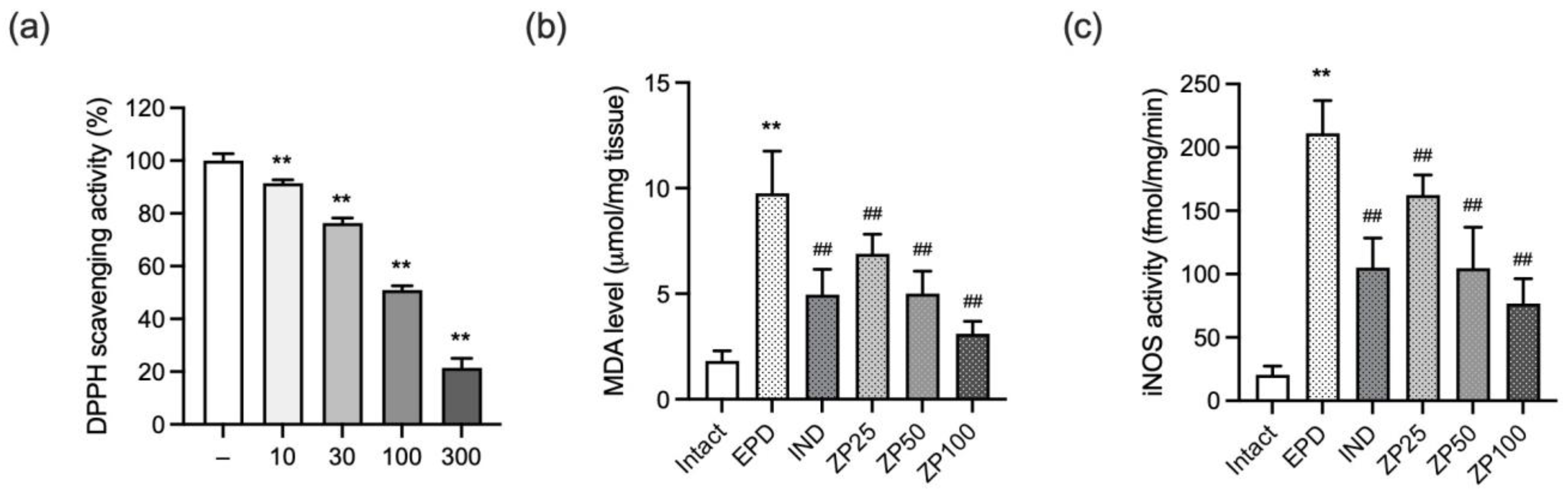 Figure 7. ZP exhibits antioxidant effects by reducing free radicals, lipid peroxidation, and nitrosative stress. (a) Radical scavenging activity was assessed by the DPPH assay. (b) Malondialdehyde (MDA) levels and (c) iNOS activity were measured in gingival tissues. Data (b,c) are presented as mean ± SD from ten animals per group. Significance versus vehicle-treated or intact vehicle control group, ** p < 0.01; versus EPD control group, ## p < 0.01.