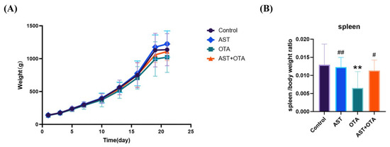 Body weight changes and the spleen organ index were recorded in chickens to evaluate OTA-induced spleen injury and the protective effect of AST. As shown in Figure 1A,B, no significant growth retardation occurred during 0–15 days, but from 15 to 21 days, the OTA group exhibited significantly lower average body weight and spleen index than the Control group (p < 0.01). Notably, the AST + OTA group showed an elevated splenic index compared with the OTA group (p < 0.05), suggesting that AST effectively mitigates OTA-induced immunotoxicity.