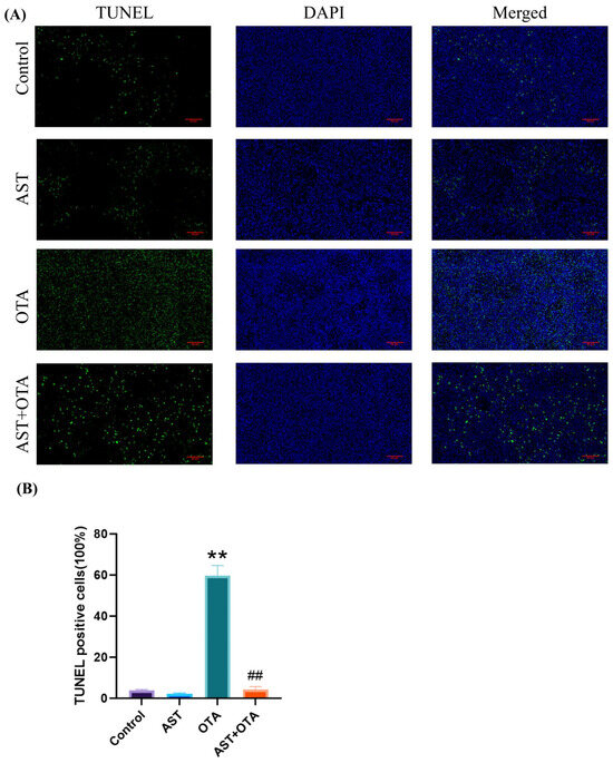 Figure 3A,B shows minimal green fluorescence in the Control and AST groups, indicating fewer apoptotic cells. The OTA group exhibited significantly stronger green fluorescence than the Control group (p < 0.01), demonstrating extensive apoptosis in the spleen. In contrast, the AST + OTA group showed markedly reduced fluorescence (p < 0.01), confirming that AST significantly inhibits OTA-induced apoptosis.