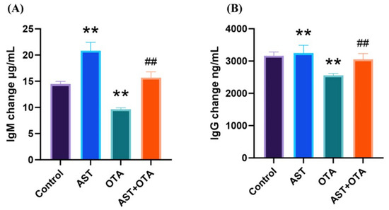 Effect of AST on immunoglobulins in serum of OTA-exposed chickens. (A) Serum IgM concentration levels in chickens; (B) Serum IgG concentration levels in chickens. ** p < 0.01 vs. Control group; ## p < 0.01 vs. OTA group.