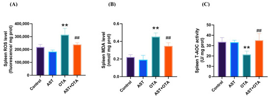 Figure 5A,B demonstrates that splenic ROS and MDA levels were significantly elevated in the OTA group compared with the Control group (p< 0.01). In contrast, the AST + OTA group showed markedly reduced ROS and MDA levels relative to the OTA group (p < 0.01). As shown in Figure 5C, T-AOC activity was significantly lower in the OTA group than in the Control group (p < 0.05), while the AST + OTA group exhibited increased T-AOC activity compared with the OTA group (p < 0.05). These results indicate that OTA significantly increases ROS production and MDA accumulation while impairing antioxidant capacity in chicken spleen, whereas AST effectively mitigates OTA-induced oxidative stress.