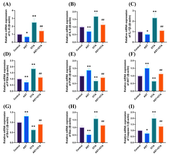 PTEN/PI3K/AKT (Ser473) pathway, apoptosis, and inflammatory factor-related gene expression. (A) IL-8, (B) IL-6, (C) IL-1β, (D) PTEN, (E) PI3K, (F) AKT, (G) Bcl-2, (H) Bax, (I) Caspase3. * p < 0.05 vs. Control group; ** p < 0.01 vs. Control group; ## p < 0.01 vs. OTA group.