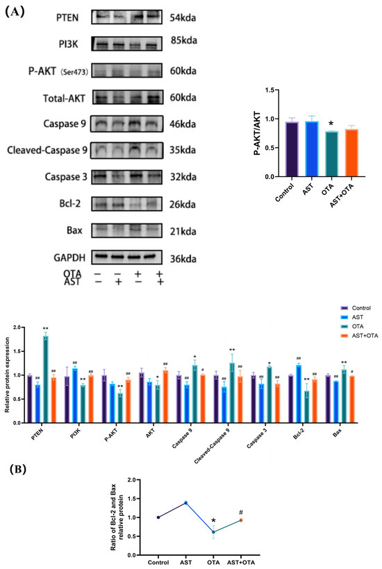 PTEN/PI3K/AKT pathway and apoptosis-related protein expression. (A) PTEN/PI3K/AKT pathway relative protein expression; (B) Ratio of Bcl-2 and Bax. * p < 0.05 vs. Control group; ** p < 0.01 vs. Control group; # p < 0.05 vs. OTA group; ## p < 0.01 vs. OTA group.