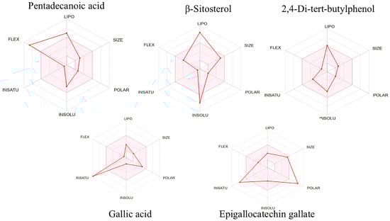 The pharmacokinetic behavior and toxicological potential of the phytochemical constituents isolated from E. floribundus stem bark were evaluated using the SwissADME and pkCSM web tools. The results are summarized in Table 3, while the bioavailability radars in Figure 2 provide a graphical comparison of their physicochemical profiles. For these bioactive compounds to qualify as promising oral therapeutics targeting antioxidant pathways, they must satisfy two critical criteria: First, they should demonstrate favorable drug-likeness by exhibiting no more than one violation of Lipinski’s Rule of Five. Second, comprehensive toxicity screening should confirm that they pose no significant risks, showing no indications of mutagenic potential, carcinogenicity, tissue irritation, or adverse effects on reproductive function [25]. This two-tiered evaluation approach helps identify compounds with favorable bioavailability and safety profiles. Among the five isolated phytochemicals, only epigallocatechin gallate (5) exhibited multiple violations of Lipinski’s Rule of Five, with all four showing either complete compliance or only one violation of these established pharmacokinetic guidelines.