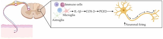 Neuropathic pain emerges from a sustained neuroimmune dialog that reshapes excitability in peripheral and central pathways [26,27,28]. The increase in pro-inflammatory cytokines, particularly interleukin-1β (IL-1β), released by immune cells, microglia, and astroglia in the spinal cord is a key initiating event [29,30]. Through IL-1 receptor signaling, IL-1β activates nuclear factor kappa-light-chain-enhancer of activated B cells (NF-κB) and mitogen-activated protein kinase (MAPK) pathways, thereby amplifying the transcription of inflammatory genes and priming cyclo-oxygenase-2 (COX-2) induction [30]. COX-2 then drives prostanoid synthesis, particularly prostaglandin E2 (PGE2), which engages E-type prostanoid (EP) receptors to enhance neuronal firing and synaptic transmission (Figure 1) [31]. In addition to maintaining nociceptive gain and lowering activation thresholds, this cytokine–eicosanoid axis also initiates a feed-forward inflammatory loop that supports chronicity and treatment refractoriness [32,33].