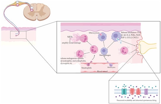 Peripheral inflammation sets the stage for chronic pain by recruiting and reprogramming innate and adaptive immune cells at and around the injured nerve [9,70]. As shown in Figure 2, neutrophils arrive first and can be analgesic in the acute phase by releasing endogenous opioids (β-endorphin, met-enkephalin, dynorphin A) and clearing pathogens [32]. When inflammation persists, they form neutrophil extracellular traps and amplify tissue damage [32]. Efficient efferocytosis—macrophage uptake of apoptotic neutrophils—helps terminate this response and accelerates pain resolution [71]. Monocytes differentiate into macrophages that orchestrate phagocytosis, antigen presentation, and cytokine production [72]. In the area around pain-sensing neurons, macrophages release molecules such as TNF, IL-1β, IL-6, PGE2, nerve growth factor (NGF), insulin-like growth factor 1 (IGF-1), and chemokines including CCL2 and C-X-C motif chemokine ligand 1 (CXCL1). These substances directly make the primary sensory neurons more sensitive by changing how ion channels, for example, by altering TRPA1 and TRPV1 activity, or by increasing the availability of voltage-gated sodium channels Nav1.7–Nav1.9 [73,74]. As a result, neurons become more excitable and may exhibit abnormal firing. Neuron–macrophage crosstalk is reinforced by CCL2/CCR2 signaling between DRG neurons and infiltrating macrophages [75]. In parallel, DAMPs such as high-mobility group box 1 (HMGB1) engage TLR4 and the receptor for advanced glycation end products (RAGE), and accelerate a CXCL12/CXCR4 axis within peripheral nerves, deepening nociceptor sensitization [73,76,77].