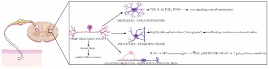 Peripheral events propagate centrally through both neural and vascular routes. Although the spinal cord is protected by the blood-medullary (blood–spinal cord) barrier, peripheral nerve injury can disrupt its integrity, permitting influx of circulating immune cells into the dorsal horn milieu [37]. At the same time, glial cells change their behavior [41]. Microglia multiply, become motile and phagocytic, show new receptors, and release pro-inflammatory signals [41,42]. Astrocytes also shift into a reactive state, keeping up the production of cytokines and chemokines [43]. Coordinated glial cell recruitment and activation cause a temporally excessive release of cytokines and chemokines, which fuel neuroinflammation and central sensitization and sustain neuropathic pain states [44]. The precise upstream signals that enforce prolonged glial overproduction after peripheral injury remain incompletely defined and are an active area of investigation [45].