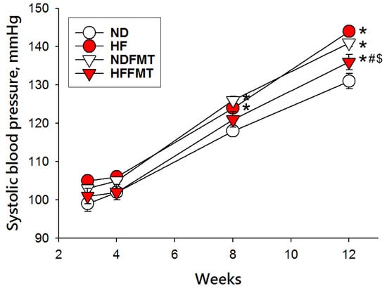 Offspring systolic blood pressure recorded from postnatal week 3 through week 12. N = 8/group. Statistical analysis by a one-way ANOVA followed by Tukey’s post hoc test. * p < 0.05 vs. ND; # p < 0.05 vs. HF; $ p < 0.05 vs. NDFMT.