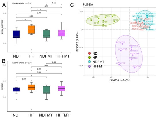 Assessment of microbial diversity among the four offspring groups included α-diversity and β-diversity analyses. (A) Pielou’s index and (B) Simpson’s index quantified species evenness and richness, respectively. For β-diversity visualization, (C) Partial Least Squares Discriminant Analysis (PLSDA) was performed, where each point corresponds to an individual sample’s microbiota profile, with colors indicating group membership. N = 8/group. Statistical analysis by a Kruskal–Wallis test followed by Dunn’s post hoc test.