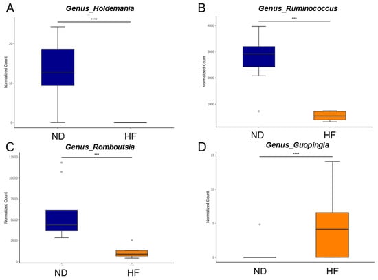 Relative abundance of the genera (A) Holdemania, (B) Ruminococcus, (C) Romboutsia, and (D) Guopingia between the ND and HF group. N = 8/group. Statistical analysis by using p-values adjusted for multiple comparisons with the false discovery rate (FDR) method. *** p < 0.005; **** p < 0.001.