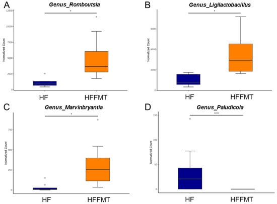Relative abundance of the genera (A) Romboutsia, (B) Ligilactobacillus, (C) Marvinbryantia, and (D) Paludicola between the HF and HFFMT group. N = 8/group. Statistical analysis by using p-values adjusted for multiple comparisons with the false discovery rate (FDR) method. * p < 0.05; **** p < 0.001.
