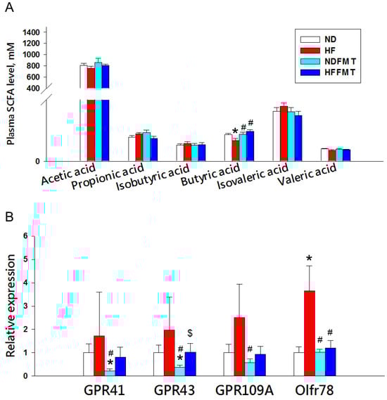 (A) Plasma concentrations of short-chain fatty acids (SCFAs) and (B) renal mRNA expression of SCFA receptors at week 12. N = 8/group. Statistical analysis by a one-way ANOVA followed by Tukey’s post hoc test. * p < 0.05 vs. ND; # p < 0.05 vs. HF; $ p < 0.05 vs. NDFMT.