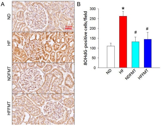 (A) Immunohistochemistry for 8-hydroxy-2′-deoxyguanosine (8-OHdG) showed predominant nuclear staining in both glomerular and tubular compartments of offspring kidneys, indicating nuclear DNA injury at these sites. (B) Quantification of 8-OHdG–positive nuclei within the renal cortex revealed group-dependent differences in oxidative DNA damage burden. Scale bar = 40 µM. N = 8/group. Statistical analysis by a one-way ANOVA followed by Tukey’s post hoc test. * p < 0.05 vs. ND; # p < 0.05 vs. HF.
