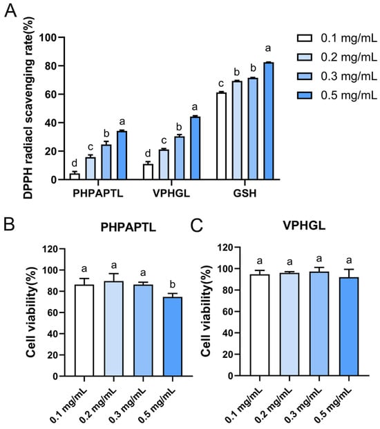 In vitro experiments on radical scavenging and cytotoxicity of the two peptides. (A) Radical scavenging rates of the two antioxidant peptides. (B) Cytotoxicity of peptide PHPAPTL at different concentrations. (C) Cytotoxicity of peptide VPHGL at different concentrations. Different letters (a–d) in the figure indicate significant differences (p < 0.05).