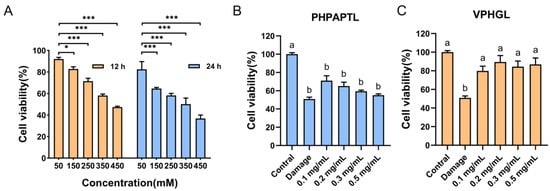 Impact of D-galactose and peptides (PHPAPTL, VPHGL) on HepG2 cell viability. (A) Effect of D-galactose on the viability of HepG2 cells. “*” indicates p < 0.05, “***” indicates p < 0.001. Effects of PHPAPTL (B) and VPHGL (C) on cell viability under D-galactose-induced oxidative stress. Different letters (a–b) in the figure indicate significant differences (p < 0.05).