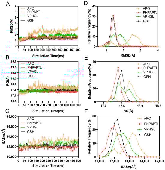 Analysis of structural stability. (A) The temporal evolution of the RMSD from their initial structure of the Apo, PHPAPTL, VPHGL and GSH systems. (B) The temporal evolution of the Rg from their initial structure of the Apo, PHPAPTL, VPHGL and GSH systems (C) The temporal evolution of the SASA from their initial structure of the Apo, PHPAPTL, VPHGL and GSH systems (D) Distribution of RMSD values in the four systems. (E) Distribution of Rg values in the four systems. (F) Distribution of SASA values in the four systems.