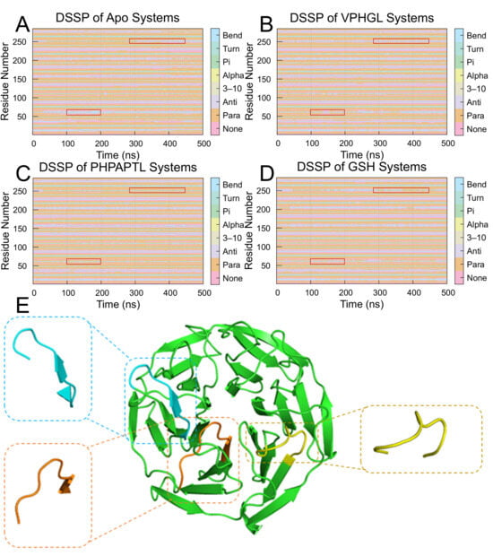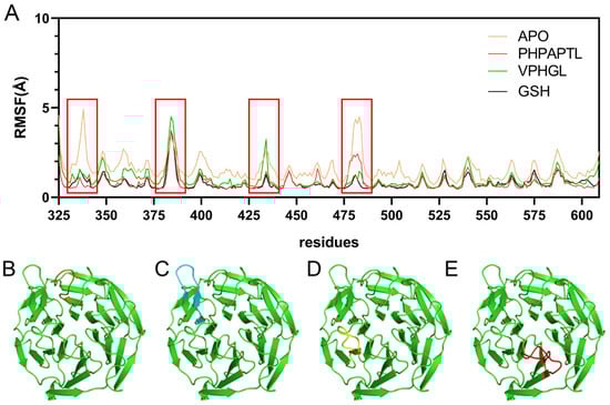 The root-mean-square deviation (RMSD) of Cα atoms was calculated to assess system stability. As shown in Figure 4A,D, all systems stabilized after 200 ns. The average RMSD values for the Apo, VPHGL, GSH, and PHPAPTL systems were 2.34 Å, 1.63 Å, 1.33 Å, and 1.34 Å, respectively, indicating enhanced stability upon peptide binding.