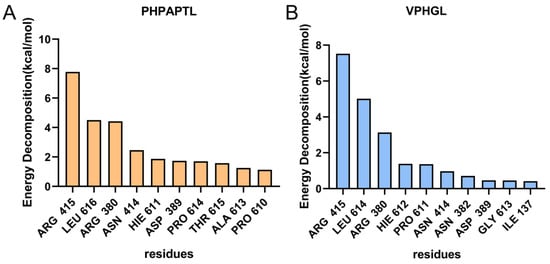 MM/PBSA (Molecular Mechanics Poisson-Boltzmann Surface Area) analysis was conducted to identify key residues involved in the binding of the antioxidant peptides to Keap1. As shown in Figure 6, residues Arg415, Arg380, Asn414, and Asp389 were identified as critical contributors to the binding energy in both peptide-Keap1 complexes. In addition, the leucine residues at positions Leu616 and Leu614 may play a functional role. The binding free energy values summarized in Table 2 revealed that PHPAPTL exhibited a stronger binding affinity compared to VPHGL, suggesting its superior stability within the Keap1 binding pocket.