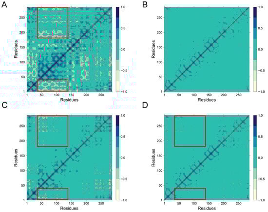 DCCM analysis was performed to quantify the correlated motions between protein residues and reveal functionally related dynamic coupling networks [35]. Position time series data of all residues were extracted from the MD trajectories after removing translational and rotational motions. Normalized cross-correlation coefficients were calculated for each pair of residues i and j. Positive values indicated correlated motion, while negative values indicated anti-correlated motion. Results were visualized as heatmaps using R Studio (version 2024.12.1+563, Posit Software, PBC, Boston, MA, USA), with color intensity representing the correlation strength.