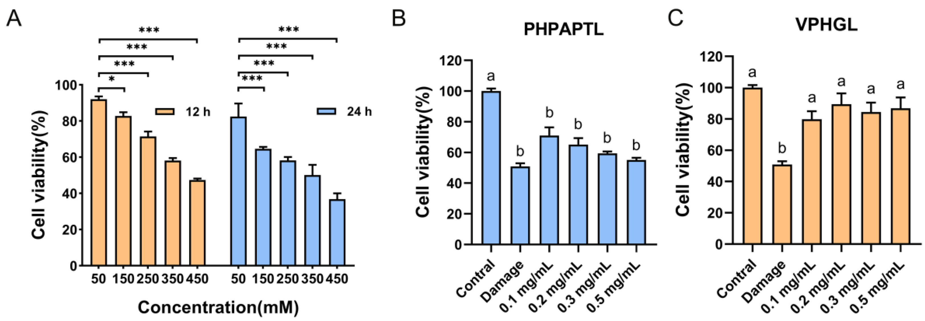 2.7. Protective Effects of Velvet Antler Antioxidant Peptides on D-Galactose-Induced Cytotoxicity