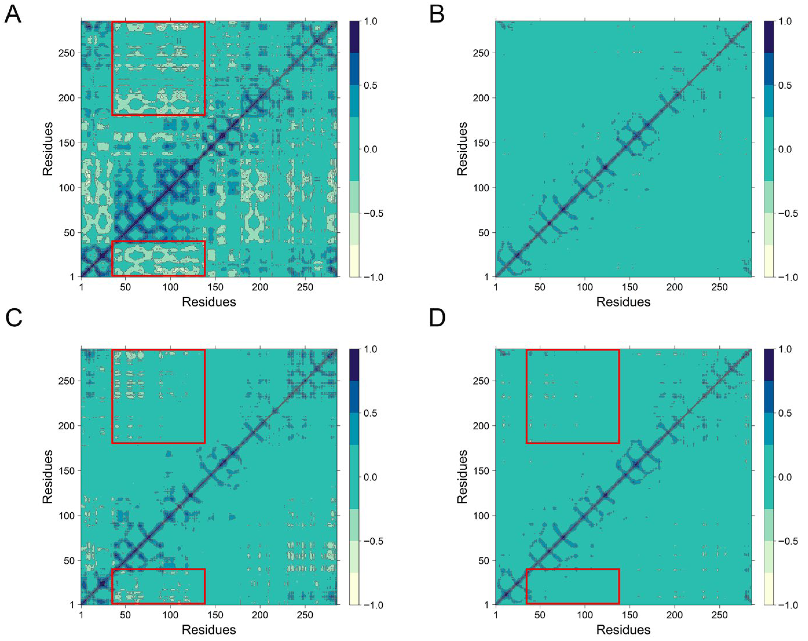 3.8. Dynamic Cross-Correlation Matrix (DCCM) Analysis