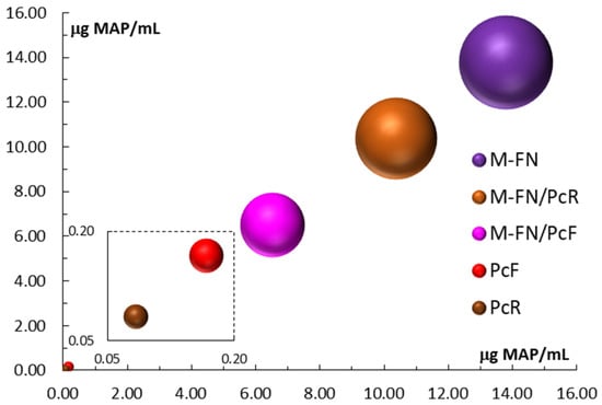 The pH of the extract M-FN indicated its high acidity, which contributed to the pH of the mixture samples M-FN/PcF and M-FN/PcR, respectively, according to data from Table 5. The pH value influences the stability and solubility of phenolic compounds. In general, an acidic pH favors the preservation of polyphenols and prevents their oxidation, an aspect also observed in the case of the extracts analyzed in this study.