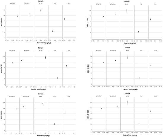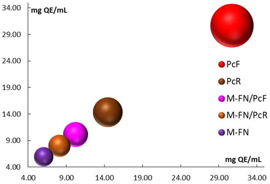 The high flavonoid content in the pomace extracts is particularly noteworthy compared to the other extracts analyzed. Among these pomace extracts, the M-FN extract stands out, with a lower TFC value of 5.976 ± 0.170 mg QE/mL (Table 6 and Figure 3). The values for the TFC of mixed extracts (i.e., grape pomace combined with P. cuspidatum) suggest a significant contribution from the Japanese knotweed flower extract. Specifically, the TFC values are as follows: M-FN extract (5.976 mg QE/mL), PcF extract (30.679 mg QE/mL), M-FN/PcF extract (10.178 mg QE/mL), and M-FN/PcR extract (8.056 mg QE/mL).