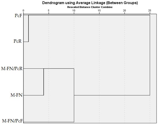 The obtained results revealed that the extracts of Japanese knotweed flower and root contained high levels of condensed tannins, with values of 15.682 ± 0.026 mg CE/mL and 9.041 ± 0.331 mg CE/mL, respectively (Table 6). These values were significantly higher compared to the other extracts analyzed (Figure 1 and Table 6). Additionally, the contribution of condensed tannins from the Japanese knotweed flower extract is evident when comparing the mixture of extracts that include this extract. For instance, the mixture M-FN/PcF showed a condensed tannin content of 6.058 ± 0.082 mg CE/mL, while M-FN alone had a lower content of 3.881 ± 0.064 mg CE/mL. Considering that the tannin content can vary depending on the plant species, the specific part of the plant, and external factors (e.g., harvesting time, season, and light intensity), certain conclusions can be drawn regarding the content of condensed tannins found in different parts of Japanese knotweed. Thus, according to studies by Furlan et al. [32], the content of tannins, which is found in most plant tissues, is in the range of 2–5% of its weight in the fresh state. However, in the dried state, the level of condensed tannins increases up to 25% of its weight, according to studies by Cuong et al. [33]. This could be one of the explanations that Japanese knotweed extracts, obtained from the dried flower and root, lead to the highest concentration of condensed tannins compared to the semi-dried grape marc extracts from which the hydroalcoholic extracts were obtained. On the other hand, Molino et al. [30] revealed that tannins are good antioxidants due to their chemical structure (i.e., benzene cycle and the phenolic hydroxyl groups), and this can stabilize free radical intermediates and maintain a balance through rapid reduction-oxidation reactions between prooxidant molecules and the tannins themselves (i.e., maintaining antioxidant/prooxidant balance) [34,35].