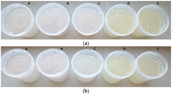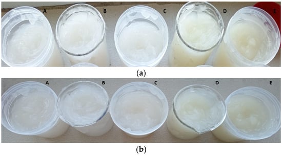 The texture analysis of the gels was investigated using a TX-700 texture analyzer (Lamy Rheology, Champagne-au-Mont-d’Or, France) fitted with a 10 kg force sensor. A two-step compression test, mimicking product application, was conducted to determine: (i) firmness (hardness)—maximum force required for initial deformation; (ii) cohesiveness—the ratio of energy between successive compressions, reflecting the structural integrity of the gel; (iii) springiness—The ability of the gel to regain its shape after deformation.