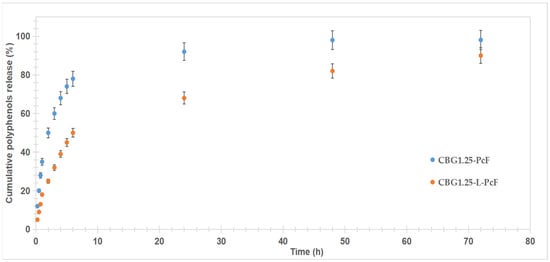 Figure 12 presents the release behaviour of the dermatocosmetic gels. The gel with free PcF (CBG1.25-PcF) shows rapid release, reaching ~92% within the first 24 h, consistent with release behavior typical of unencapsulated extracts. In contrast, the liposome-based gel (CBG1.25-L-PcF) demonstrates controlled and sustained release, with only ~68% release at 24 h, extending up to ~90% at 72 h. This supports the role of liposomes in modulating release kinetics.