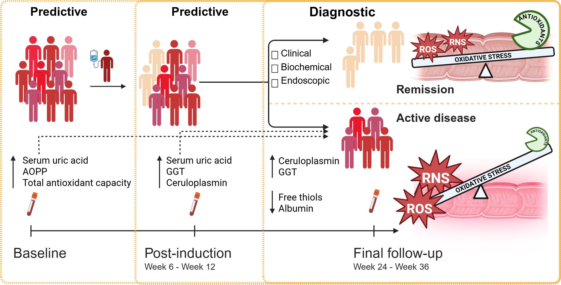 CD and UC are often recognized as progressive disorders, where sustained inflammation can result in irreversible bowel damage. To address this, treatment goals in IBD have evolved significantly over the past decade, shifting from symptom control towards more objective measures such as endoscopic healing [8]. Initial clinical response should be followed by clinical remission. Biochemical remission is initially assessed by normalization of the C-reactive protein (CRP) levels, followed by normalization of fecal calprotectin. Ultimately, long-term treatment goals aim to achieve endoscopic healing and restore the quality of life [8,9]. Therapeutic goals are evolving towards achieving disease clearance and restoring molecular pathways involved in the pathogenesis of IBD, potentially including redox-sensitive signaling pathways [8,10]. Despite evidence linking oxidative stress-related biomarkers with IBD activity, their potential roles in both assessing and predicting clinical, biochemical, and endoscopic remission remain unclear.