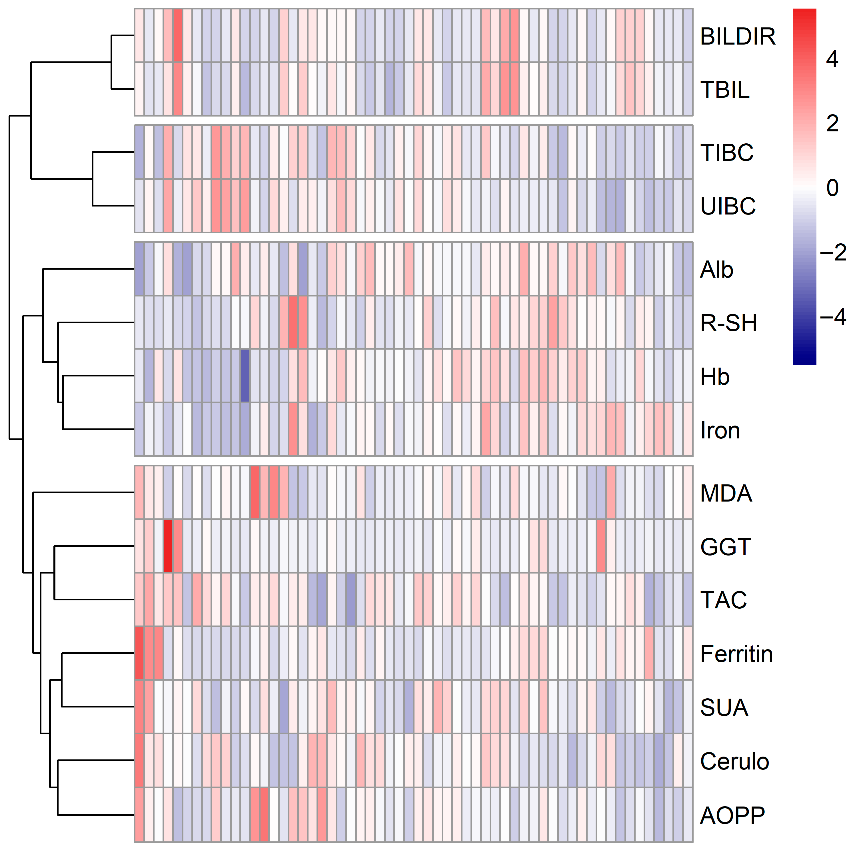 The first five components had eigenvalues greater than 1 (Supplementary Material, Figure S2), cumulatively explaining approximately 70% of the total variance (PC1: 21.7%, PC2: 19.2%, PC3: 11.1%, PC4: 9.5%, PC5: 8.1%). Table 4 lists the factor loadings for the first five components. PC1 showed the strongest loadings from R-SH, PC2 was characterized by TIBC and UIBC, while PC3 showed loadings from TBIL and GGT. PC4 was primarily influenced by TAC and SUA, and PC5 by MDA and SUA.