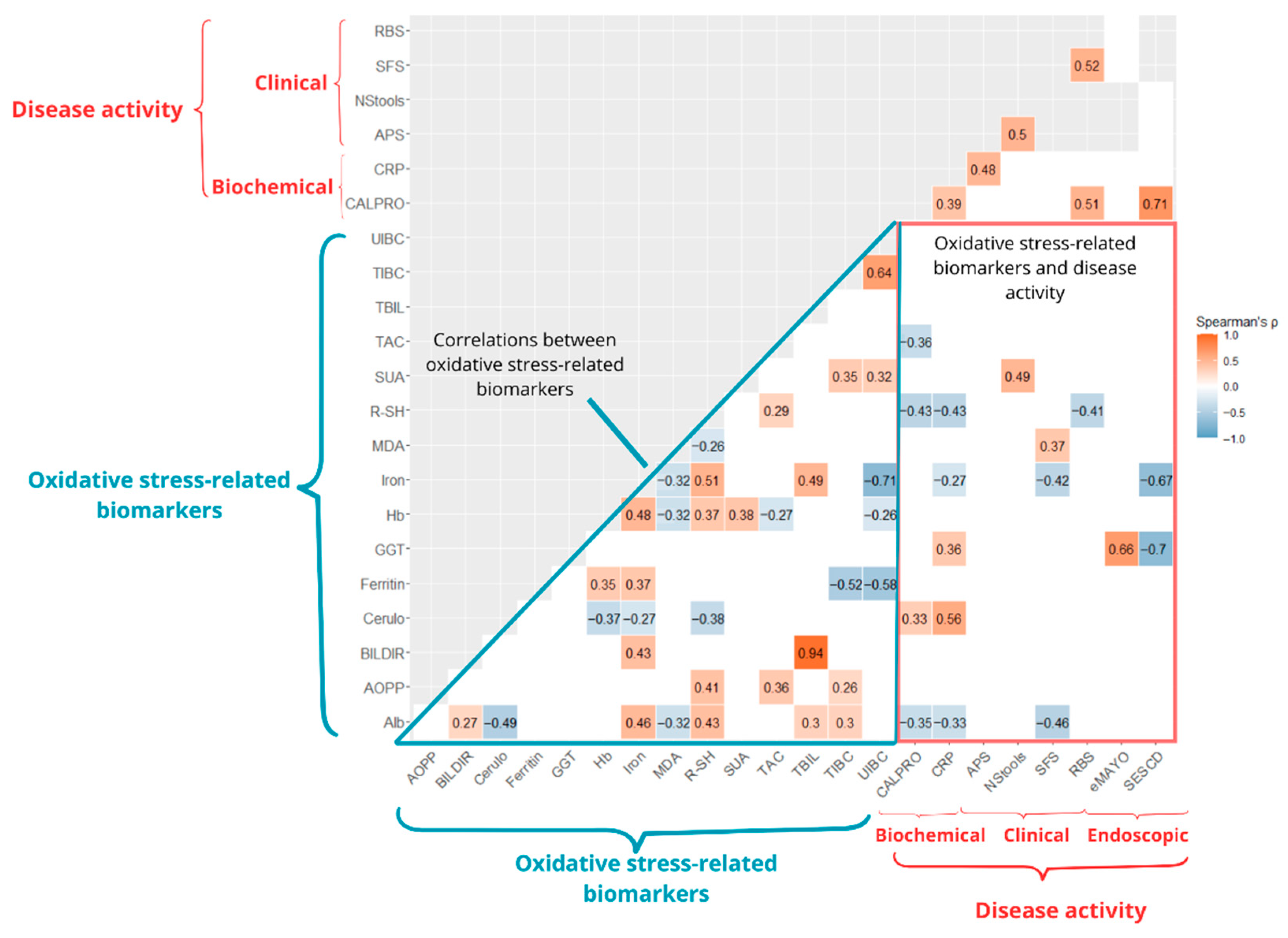 Spearman’s rank-order correlation coefficient was used to evaluate associations between continuous variables. Next, a correlation matrix was constructed to visualize relationships among oxidative stress-related biomarkers and disease activity at Visit 3.