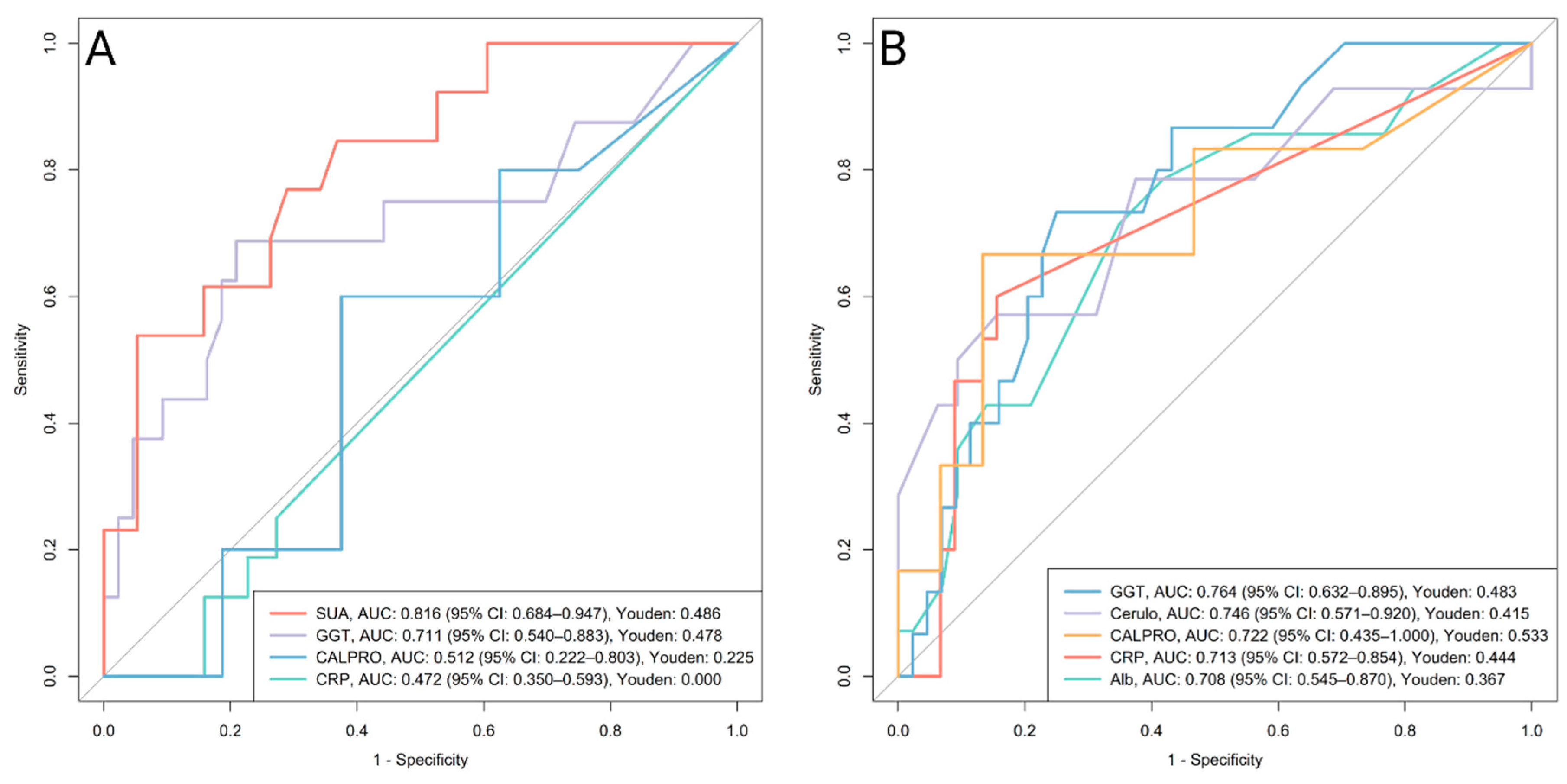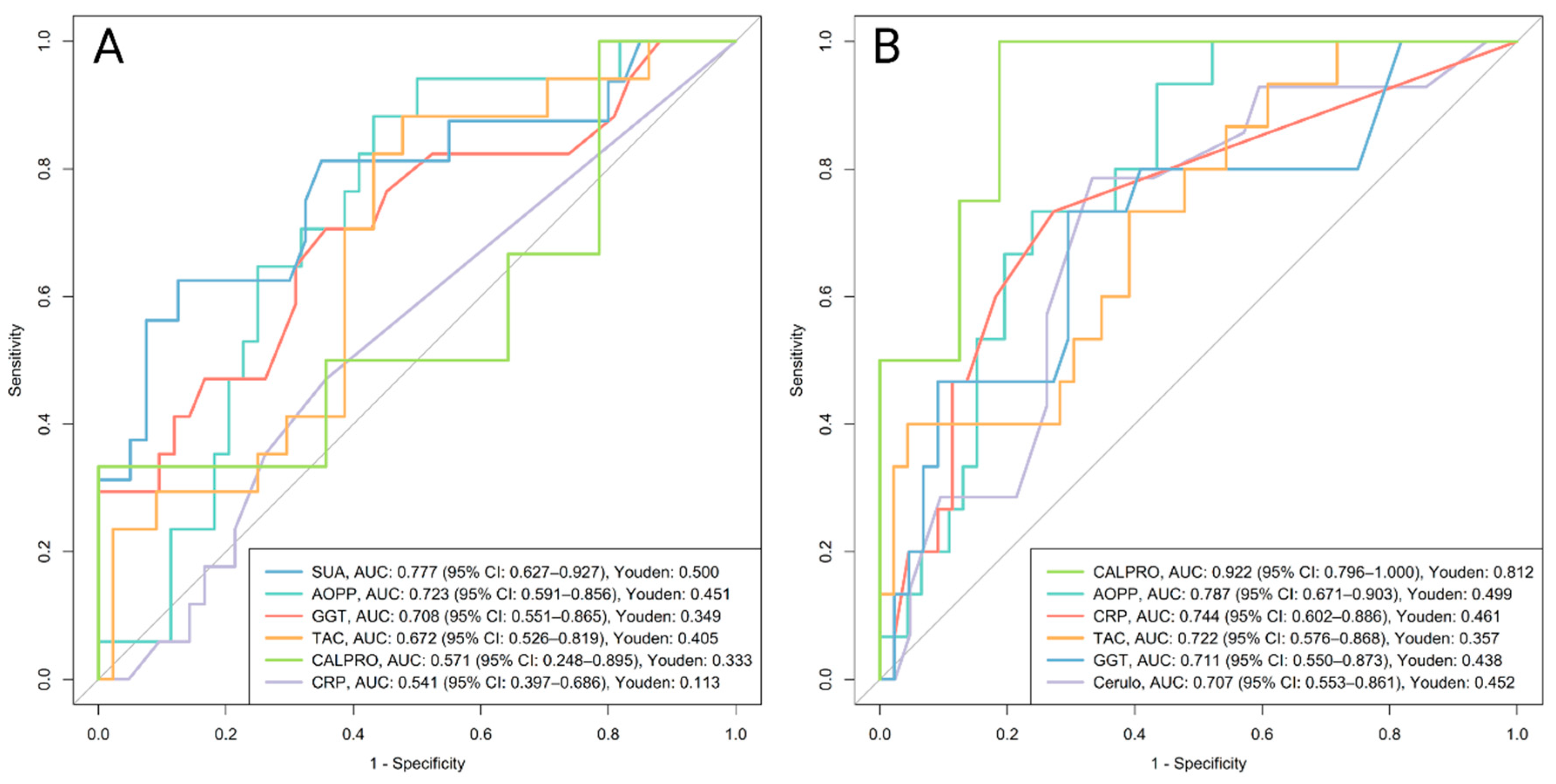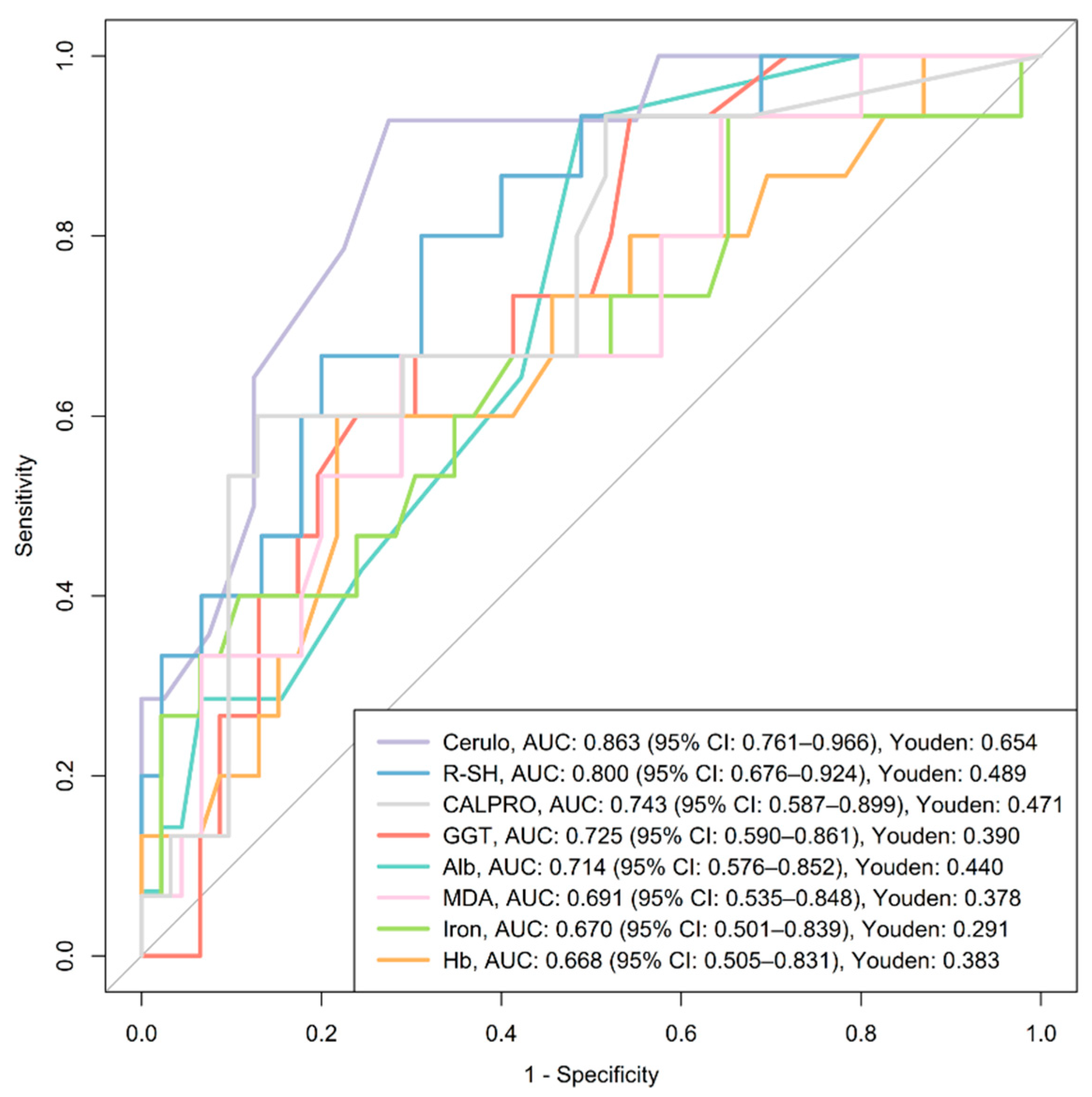 In subgroup analyses, no biomarkers remained significant for CD after adjustment. In UC, ceruloplasmin showed the best performance (AUC 0.912, 95% CI 0.774–1.000), with higher levels in active disease (median 0.31 g/L, IQR 0.28–0.35; n = 9) versus remission (median 0.25 g/L, IQR 0.22–0.26; n = 17; p = 0.011).
