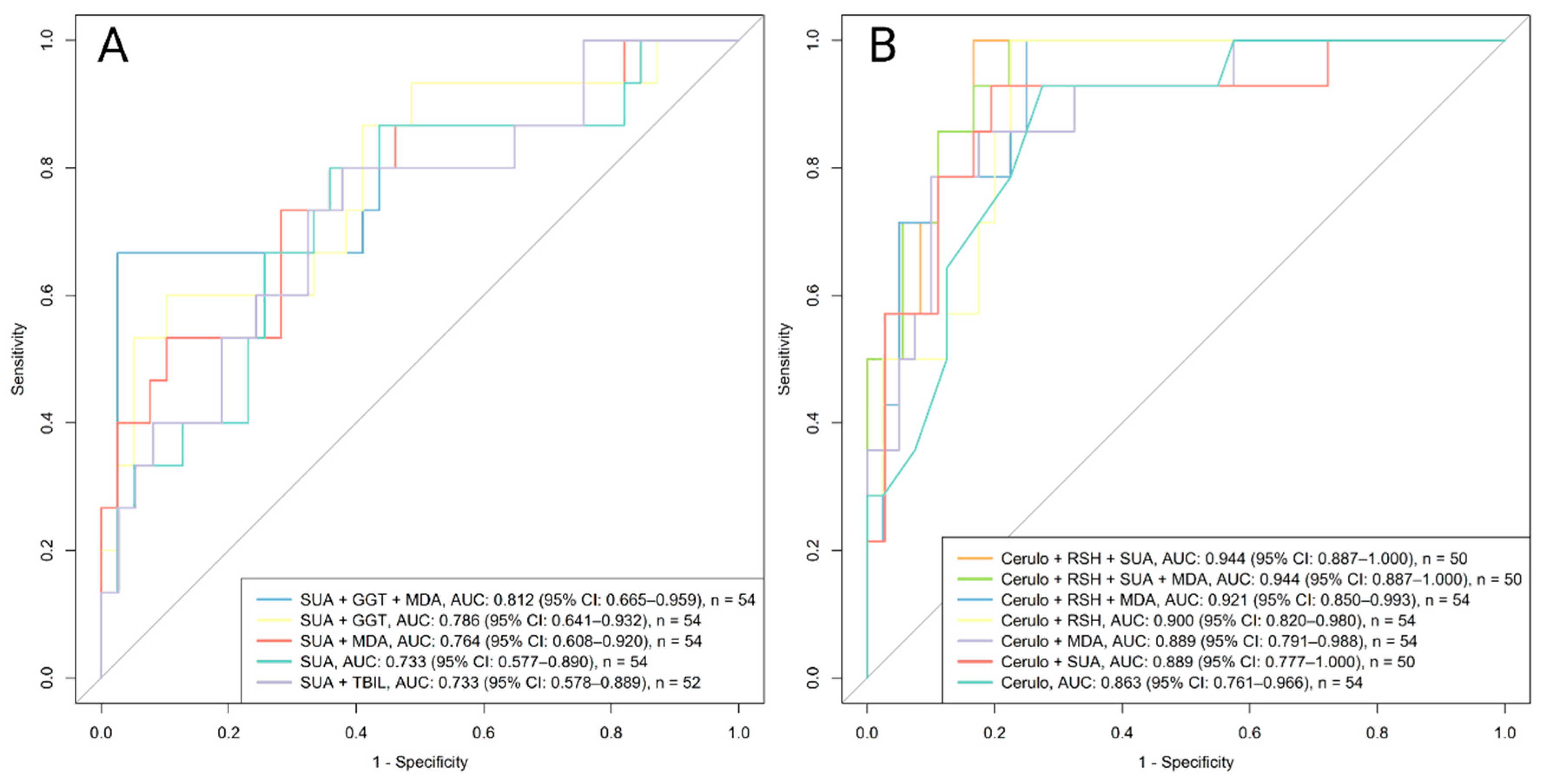 Biochemical (CRP) remission. Ceruloplasmin was tested in combination with biomarkers showing the highest loadings from PC1 (R-SH) and PC5 (MDA, SUA) (Table 4 and Table 5). The best combination (ceruloplasmin, R-SH, SUA) achieved an AUC of 0.944 (95% CI 0.887–1.000) (Figure 7B), but the difference versus ceruloplasmin alone was not significant (p = 0.181).