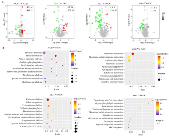 As shown in Figure 1A, a total of 67 differential metabolites (46 up-regulated and 21 down-regulated) were identified in the OOC vs. CON comparison. These differential metabolites were significantly enriched in purine metabolism, pentose phosphate pathway, metabolic pathways, and oxidative phosphorylation (Figure 1B). Compared with the OOC group, a total of 25 (14 upregulated and 11 downregulated), 45 (8 upregulated and 37 downregulated) and 19 (2 upregulated and 17 downregulated) differential metabolites were identified in the MAG, RUT and GAA groups, respectively (Figure 1A, Tables S2–S4). Differential metabolites between the MAG and OOC groups were significantly enriched in propanoate metabolism and apelin signaling pathway. Differential metabolites between the RUT and OOC group were significantly enriched in purine metabolism, folate biosynthesis and pyrimidine metabolism (p < 0.05). In contrast, no enriched pathways were detected for the differentially expressed metabolites between the OOC and GAA groups.