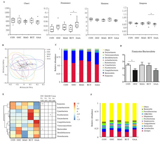 As shown in Figure 2A, no significant differences in alpha diversity (Chao1, Dominance, Shannon, and Simpon) were found between the CON and OOC groups (p > 0.05). However, the Dominance index in the GAA group was significantly higher than that in the RUT group, while the Simpson indices were significantly lower (p < 0.05). PCoA revealed that the microbial communities across groups were not completely separated (PCoA1, 34.78%; PCoA2, 12.89%) (Figure 2B). The dominant phyla in the cecum of all groups were Firmicutes and Bacteroidetes (Figure 2C). Compared with the CON group, the OOC group showed a significant decrease in Firmicutes (p < 0.01) and an increase in Bacteroidetes (p < 0.05) (Figure 2E), resulting in a significantly reduced Firmicutes/Bacteroidetes ratio (p < 0.05) (Figure 2D). At the genus level, the most abundant genus was Alistipes, followed by Lactobacillus and Bacteroides (Figure 2F).