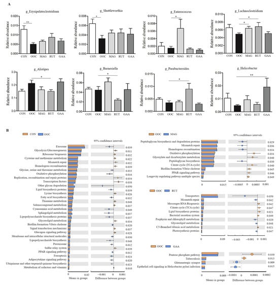 The relative abundances of the top 50 genera are listed in Table S5, with differential abundant genera illustrated in Figure 3A. Compared to the CON group, the OOC group exhibited significantly lower abundances of Erysipelatoclostridium (p < 0.01) and Shuttleworthia (p < 0.05). Although supplementation with the three polyphenols increased the relative abundance of these genera compared to the OOC group, the differences did not reach statistical significance (p > 0.05). Compared to the OOC group, the abundance of Enterococcus was significantly increased in the MAG group, Lachnoclostridium was elevated in the MAG and RUT groups (p < 0.05), and Helicobacter was higher in the GAA group (p < 0.01). In contrast, the relative abundances of Alistipes and Barnesiella were significantly reduced in the RUT group compared to the OOC group (p < 0.05). The predictive functions of the cecal microbiota are shown in Figure 3B. Compared to the CON group, the OOC group exhibited decreased activity in key energy metabolism pathways (glycolysis/gluconeogenesis and glycerolipid metabolism), but showed increased activity in lipid regulatory pathways (sphingolipid metabolism and PPAR signaling) and lipopolysaccharide biosynthesis (p < 0.05). Compared to the OOC group, magnolol supplementation led to a reduction in pathways related to oxidative phosphorylation, glyoxylate and dicarboxylate metabolism, citrate cycle and PPAR signaling pathway. Rutin supplementation reduced activity in pathways associated with citrate cycle, lipid biosynthesis proteins, bacterial secretion system, and C5-branched dibasic acid metabolism, while increasing those related to porphyrin and chlorolipid metabolism and glycerolipid metabolism.