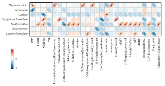 The microbial correlation analyses. Red represents positive correlation while blue represents negative correlation. * means p < 0.05. Abbreviations: BW: body weight, T-SOD: total superoxide dismutase, GSH-Px: glutathione peroxidase.