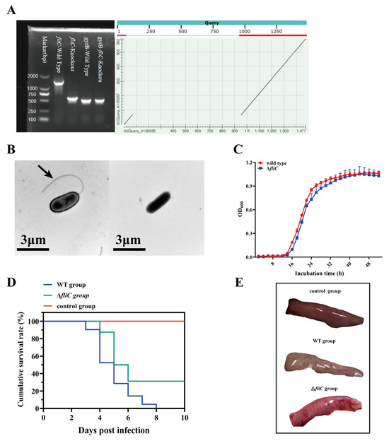 The fliC gene contributed to the pathogenesis of P. plecoglossicida. (A): Construction of P. plecoglossicida ∆fliC mutant strain. (B): Electron microscopy of WT and ∆fliC; arrows indicate the flagella of the WT strain. (C): In vitro growth kinetics of WT and ∆fliC. (D): Survival rates of large yellow croakers infected with WT or ∆fliC. (E): Livers of moribund large yellow croakers infected with WT or ∆fliC.