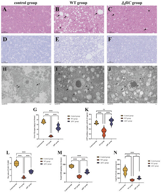 fliC involved in disruption of energy metabolism in large yellow croaker livers. (A–F): Hepatic histopathological features. (A–C): HE staining. Arrows indicate vacuolar degeneration cells; asterisk indicated infiltrating inflammatory cells. (D–F): PAS staining; (A,D): control group; (B,E): WT group; and (C,F): ΔfliC group. (H–J): Hepatic ultrastructural features of livers. (H): control group. (I): WT group. (J): ΔfliC group. Arrows indicate mitochondria, asterisk indicates endoplasmic reticulum. (G,K–N): livers of large yellow croaker’s liver glycogen (G), total liver ATP synthase complex activity (K), the ratio of NAD+/NADH (L), total liver GSH (M), and total liver lipid peroxide (N) were determined. ns: not significant. ***: p < 0.01.