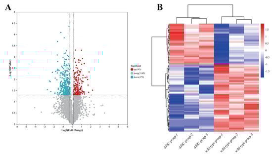 Analysis of differentially expressed proteins in livers of large yellow croakers infected with WT and ΔfliC. The volcano plot (A) and heatmap (B) of differentially expressed proteins in livers of large yellow croakers infected with the WT or ΔfliC.