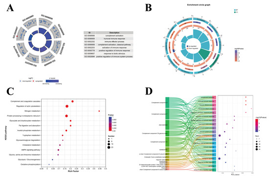 Comparative proteomics analysis between the livers of large yellow croakers infected with WT and ΔfliC. (A,B): GO enrichment analysis related to immune response. (C): KEGG pathway enrichment analysis for differentially expressed proteins. (D): Sankey diagram illustrating interactions of the complement component family with enriched pathways.