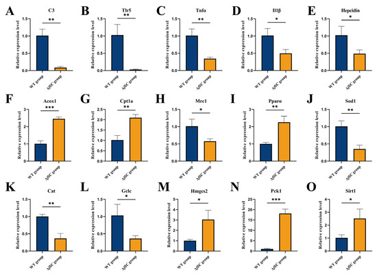 Relative expression levels of immunometabolic genes in the livers of large yellow croakers infected with WT and ΔfliC. (A) C3 (complement component 3), (B) Tlr5 (Toll-like receptor 5), (C) Tnfα (tumor necrosis factor-alpha), (D) Il1β (interleukin-1 beta), (E) Hepcidin (iron-regulatory antimicrobial peptide), (F) Acox1 (acyl-CoA oxidase 1), (G) Cpt1a (carnitine palmitoyltransferase 1A), (H) Mrc1 (macrophage mannose receptor 1), (I) Pparα (peroxisome proliferator-activated receptor alpha), (J) Sod1 (superoxide dismutase 1), (K) Cat (catalase), (L) Gclc (glutamate–cysteine ligase catalytic subunit), (M) Hmgcs2 (3-hydroxy-3-methylglutaryl-CoA synthase 2), (N) Pck1 (phosphoenolpyruvate carboxykinase 1), and (O) Sirt1 (sirtuin 1). All values are expressed as mean ± SD, n = 3. Significant differences between the WT and ΔfliC groups are indicated by asterisks: *, p < 0.1; **, p < 0.05; ***, p < 0.01.