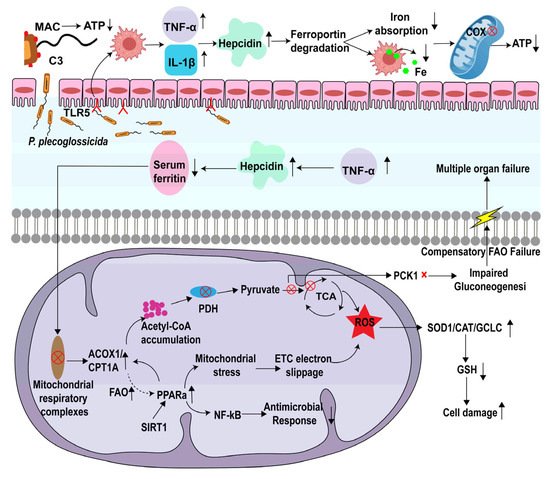 Upon pathogenic challenge, the host initiates metabolic reprogramming to fuel immune responses [24]. Conversely, to prevent the pathogen exploitation of nutrients, the host employs nutritional immunity by sequestering or expelling energy substrates [25]. Regardless, infection inevitably disrupts metabolic homeostasis and drives its restructuring. P. plecoglossicida induces a cytokine storm in large yellow croakers [11]. The flagella serve as one of the inflammatory triggers. For instance, Salmonella Typhi flagella activated the host TLR5-mediated innate immunity, and their deletion not only alleviated inflammation or downregulated inflammatory markers such as TNF-α/IL-1β [26] but also reduced virulence. In the case of P. plecoglossicida, fliC deletion led to attenuated virulence (Figure 1D) and alleviated inflammation (Figure 5).