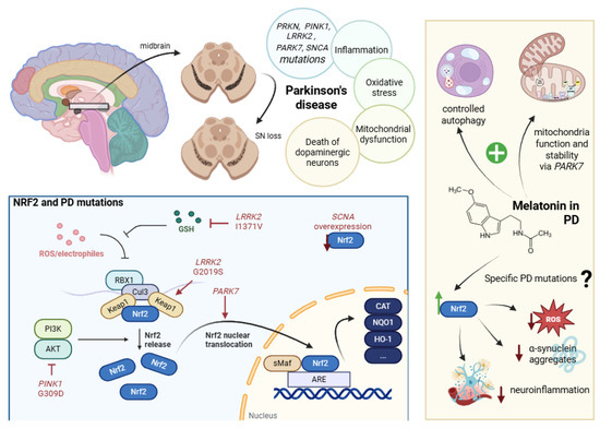 PD-related mutations and the possible impact of melatonin. Top left: PD is characterized by the loss of dopaminergic neurons in the substantia nigra of the midbrain, driven by several synergistic contributing processes, among which PD-related gene mutation can be implicated. Bottom left: Molecular regulation of Nrf2 by these mutations and how they affect its different activation and translocation states. Right: Suggested protective role of melatonin in PD via increased cellular dynamics stability and Nrf2 activation. Created with BioRender 201.