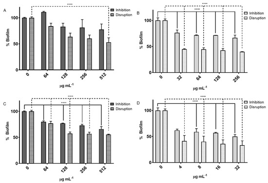 The greater effect observed on biofilm disruption compared to inhibition may be explained by the structural complexity of mature biofilms, which act as physical and chemical barriers against external agents. The ability of these extracts to affect mature biofilms is promising for developing complementary therapies that enhance the efficacy of conventional antibiotics.