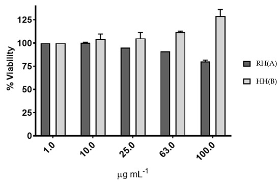 The antioxidant activity was measured by the DPPH assay [20]. A total of 1 mL of 0.1 mM DPPH in ethanol was mixed with 50 µL of RH or HH extract, gallic acid, TROLOX and Vitamin C (20 µg mL−1). The decrease in absorbance due to reduction of DPPH (purple to yellow) was recorded at 518 nm after 20 min using an Epoch ELISA reader (ELx800; BioTek, Winooski, VT, USA). Radical scavenging was calculated as: